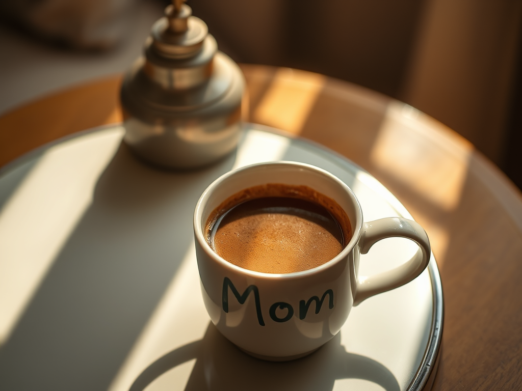 Brings me a hot cup of coffee and sets it on the bedside table